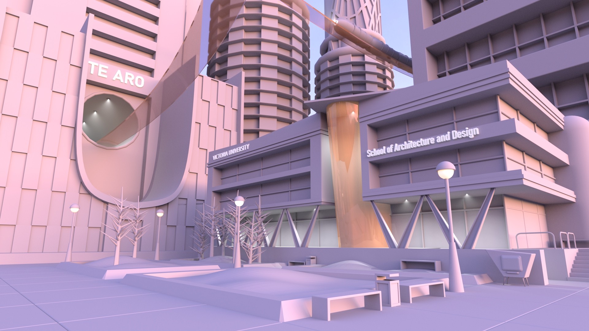I was tasked with reimagining an iconic Wellington, NZ location in a unique visual design style. I chose the Wellington Faculty of Architecture and Design Innovation / Te Wāhanga Waihanga-Hoahoa and decided to re-envision it through a Retrofuturism lens.